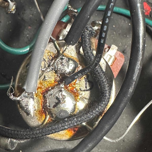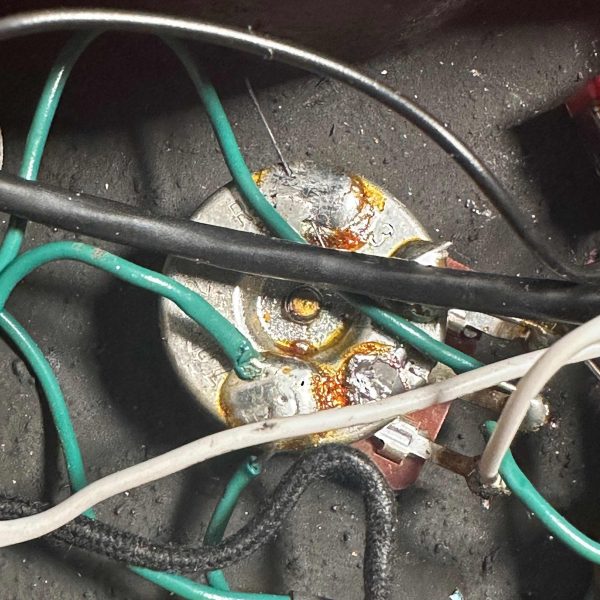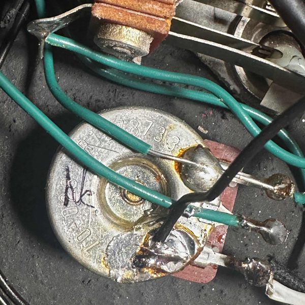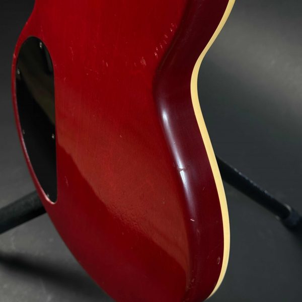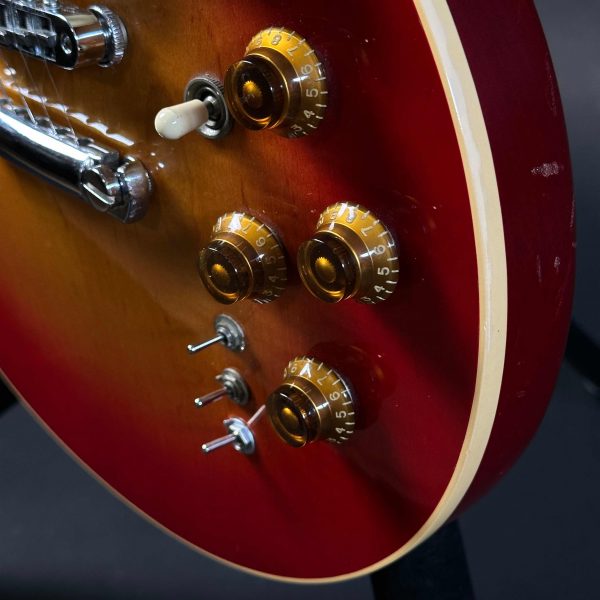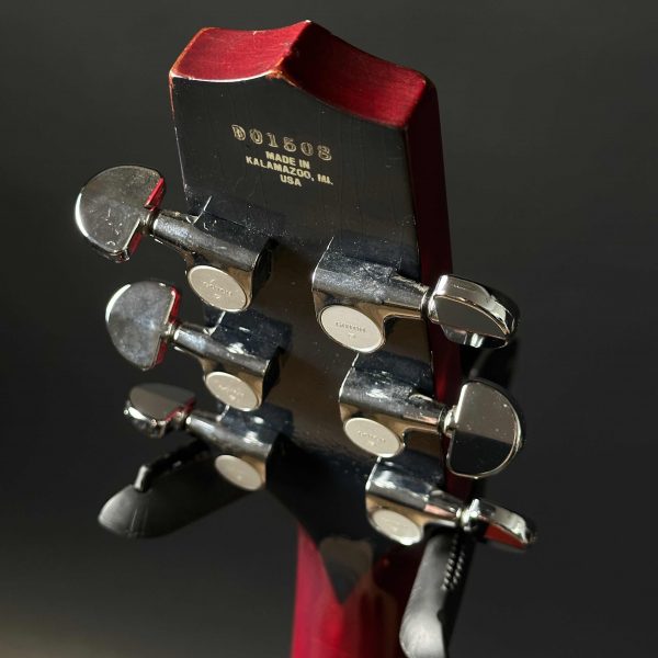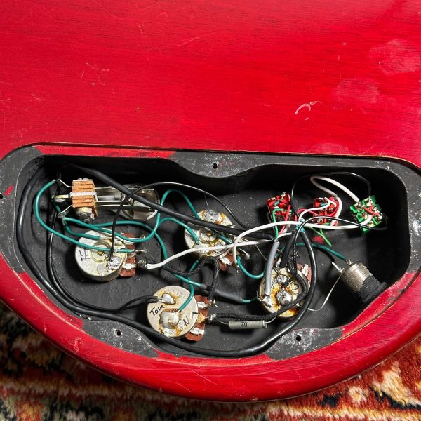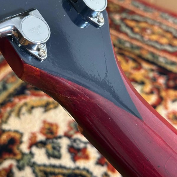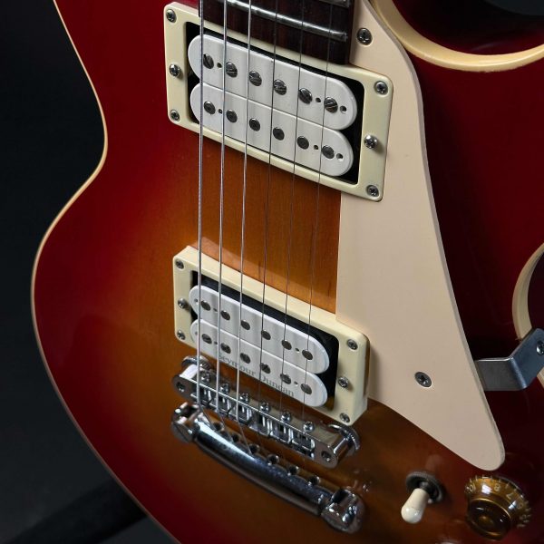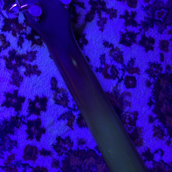 Die Gitarre hat eine veränderte Schaltung: beide Humbucker sind splitbar und der dritte Toggle ist ein Killswitch. Besonders Highlight und gleichzeitig der Grund für den günstigeren Preis: Die Gitarre hatte einen factory stinger, erlitt aber im Laufe der Jahre einen Halsbruch, welcher fachmännisch repariert wurde. In dem Zuge, wurde der Stinger wieder nahtlos auflackiert. Den Farbunterschied sieht man nur unter Schwarzlicht (siehe Bilder). Die Seriennummer wurde bei der Prozedur erhalten.